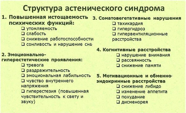 Астенические расстройства развиваются исподволь и характеризуются нарастающей интенсивностью. Иногда первыми признаками синдрома являются повышенная утомляемость и раздражительность, сочетающиеся с нетерпеливостью и постоянным стремлением к деятельности, даже в обстановке, благоприятной для отдыха ("усталость, не ищущая покоя").