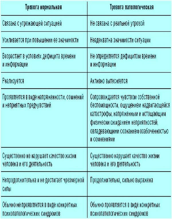 С основными отличиями нормальной тревоги от патологической можно ознакомиться в представленной ниже таблице.
