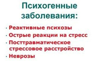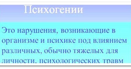 При психогениях, под воздействием переживаний, травмирующих психику, происходят болезненные изменения в деятельности нервной системы и внутренних органов, степень тяжести которых варьирует от кратковременных реакций до длительного состояния болезни.
