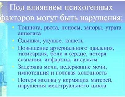 Действие психогенных (психотравмирующих) факторов может привести к возникновению в организме, различных по тяжести отклонений, вплоть до развития серьезных расстройств – реактивных психозов и поражений внутренних органов.
