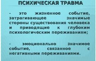 Под психотравмой понимают, тяжелые переживания, возникшие вследствие различных событий, ситуаций и требований жизни, способных, подобно физической травме, серьёзно расстроить работу нервной системы, а через неё нарушить деятельность внутренних органов, травмированного организма.