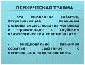 Под психотравмой понимают, тяжелые переживания, возникшие вследствие различных событий, ситуаций и требований жизни, способных, подобно физической травме, серьёзно расстроить работу нервной системы, а через неё нарушить деятельность внутренних органов, травмированного организма.